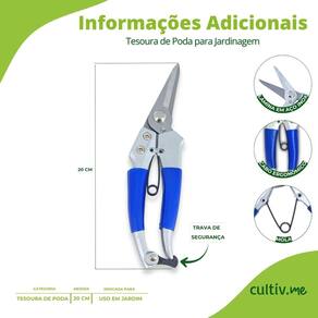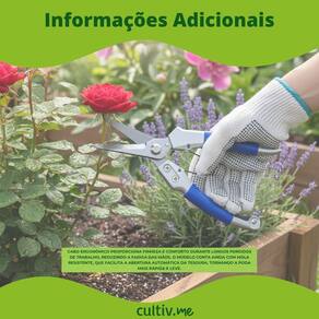 Características * Tipo: Tesoura de poda * Tamanho: 20 x 5 x 2 cm * Material da lâmina: Aço Inox * Cabo: Emborrachado e ergonômico * Trava de segurança: Sim * Indicação: Podas de flores, galhos verdes até 2cm e plantas ornamentais * Função: Corte limpo, seguro e preciso
