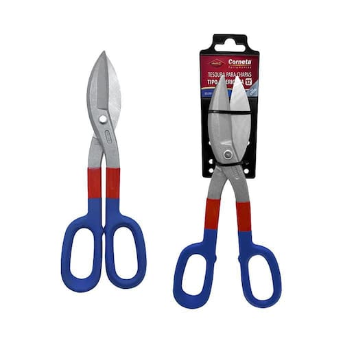Tesoura para chapas tipo americana com medida de 12 polegadas fabricada em aço cromo vanádio e forjada em aço especial. Perfeita para cortar chapas nas atividades de funilaria, com eficiência e praticidade.Marca: CornetaCaracterísticas: -medida: 12 Pol. -material: Aço cromo vanádio. -forjada em aço especial. -corpo fosco. -lâminas retificadas com têmpera na área de corte -cabos com acabamento resistente.Conteúdo: -1 Tesoura para chapas.Aplicação: Ideal para corte reto de chapas nos trabalhos de funilaria, caldeiraria, serralheria industrial, montagem de calhas e condutores em geral.Código: 2328112