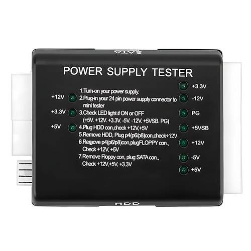 Indicadores led: leds dedicados para cada tensão 3,3v, 5v, 12v, -5v, -12v e 5vsb facilitam a leitura dos níveis de energia. Os leds acendem conforme os parâmetros de cada voltagem, permitindo uma verificação visual e instantânea de anomalias. Verificação de estabilidade: detecta rapidamente falhas de tensão, curtos-circuitos e problemas de estabilidade na alimentação elétrica, garantindo que a fonte esteja fornecendo a energia correta para todos os componentes do sistema. Fácil de usar: basta conectar a fonte ao testador e os indicadores led exibirão o status da alimentação. Não é necessário software ou calibrações complexas. Ideal tanto para iniciantes quanto para técnicos experientes. Design portátil e resistente: com construção robusta e tamanho compacto, o testador é fácil de transportar e resistente o suficiente para o uso diário em oficinas ou ambientes de reparo.