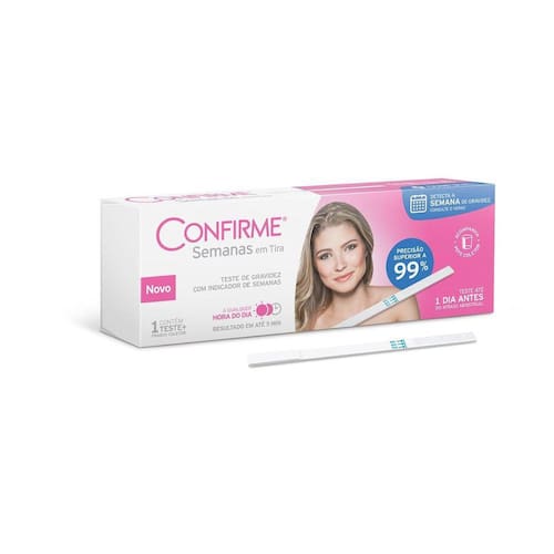 Teste de Gravidez Confirme com indicador de semanas 1 tira Teste imunocromatográfico para detecção de Hcg gonadotrofina coriônica humana - amostra urina.1 caixa com 1 envelope aluminizado contendo 1 unidade de dispositivo de Teste com membrana reativa impregnada de anticorpos policlonal, monoclonal e conjugado de cor para detecção de hCG/10m UI/mL detecção do hormônio hCG em semanas . 01 coletor de urina - 01 instrução de uso - Precisão Superior a 99%.