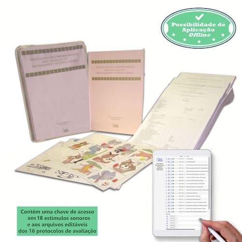 ° um livro teórico-prático com 82 páginas; ° 16 protocolos de avaliação; ° 4 cartelas ilustradas; ° chave de acesso aos estímulos sonoros necessários para esta investigação do processamento auditivo e aos arquivos para impressão dos protocolos de avaliação.