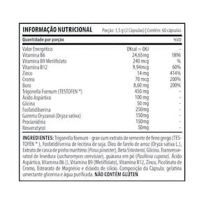 Demon T Demons Lab Você não apenas investe em seu bem-estar, mas também em uma série de benefícios para qualidade de vida e para o seu cotidiano, o suplemento Demon T será um aliado constante para você. Essencial para quem busca aumento da massa magra, força e alcançar metas de peso. Sua fórmula otimizada promove o bem-estar geral, fornecendo energia, força vital e disposição para treinos e exercícios, dentro ou fora da academia, sendo seu aliado para um alto desempenho a todo momento. Benefícios: Propriedades que podem trazer benefícios ao bem-estar do seu corpo em geral; Atua no ganho de massa; Força e resistência; Pode atuar ao seu desempenho; Contribui para a energia e síntese proteica; Benefícios especifico para homens e mulheres; Pode atuar aos níveis de açúcar; Vitalidade; Pode beneficia a pele; Antioxidante; Contém Resveratrol; Minerais em sua composição, dando mais benefícios ao produto; Rico em nutrientes como vitaminas B6, B12 e B9, Fe.No, zinco e cromo. A semente de fe.No grego pode potencializar a força, resistência e até ao pós-treino. Quando combinado com o mineral boro, pode otimizar a absorção de vitaminas e minerais, oferecendo um suporte completo. Essa combinação premium de zinco, vitamina B6, saponinas e boro é perfeita para atletas e para quem busca energia, força e disposição no dia a dia. Sugestão de uso: Consumir 1,5 2 capsulas ao dia ou conforme recomendação profissional nutricional. Marca: Não Informado Ean: 7898713952388