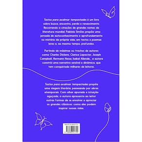 “E de repente, num dia qualquer, acordamos e percebemos que já podemos lidar com aquilo que julgávamos maior que nós mesmos. Não foram os abismos que diminuíram, mas nós que crescemos...” Textos para acalmar tempestades é um livro sobre busca, encontro, perda e renascimento. Recorrendo a citações de grandes nomes da literatura mundial, Fabíola Simões propõe uma jornada de autoconhecimento e aprofundamento no mistério da própria vida, em textos e poemas leves e, ao mesmo tempo, profundos. Partindo de máximas ou trechos de autores como Charles Dickens, Clarice Lispector, Joseph Campbell, Hermann Hesse, Isabel Allende... a autora constrói uma narrativa sensível e dinâmica, que tem conquistado milhares de leitores.