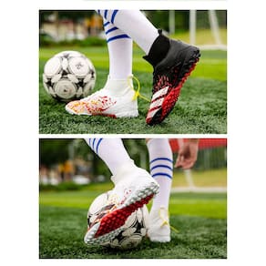 Alta parte superior sintética de alto desempenho combinada com gola têxtil proporciona um ajuste leve, é uma boa opção de sapato de futebol A gola de alto ajuste cria um ajuste seguro e de apoio e protege o tornozelo Sourada na parte superior para durabilidade, sola externa Borracha antiderrapante com alta aderência Equipe de trabalho profissional com boa tecnologia de acabamento de produção Amplos usos: treinadores de futebol, competição, caminhadas, corrida, é adequado para grama l, jogos de borracha, grama artificial e solo firme, solo duro, etc. .