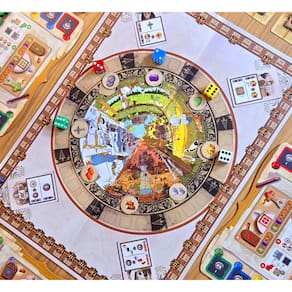 1 a 4 Jogadores | 60 min | Idade: 10+ Conteúdo 24 peças de estandarte4 marcadores20 peças madeira20 peças tijolos20 peças pedras15 peças ouro10 peças jóias verdes10 peças jóias roxas1 tabuleiro4 tabuleiros de recursos28 peças de oficina16 ornamentos40 peças de moedas66 cartas05 dados08 peças de recursos01 manual em português