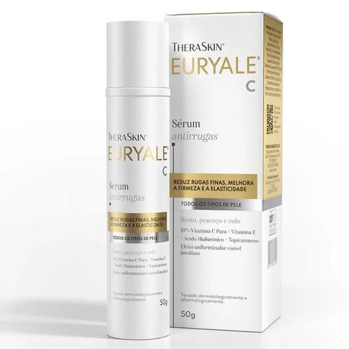 Theraskin Euryale C Sérum Anti-Idade 50gTheraskin Euryale C Sérum Anti-Idade 50g é um sérum anti-idade com potente ação antioxidante. Possui fórmula completa que protege as células da pele do envelhecimento precoce, atenua rugas finas e linhas de expressão e estimula a produção de colágeno deixando a pele mais rejuvenescidas e hidratada. Possui ação antibrilho e controla a oleosidade. Com tecnologia Age Complex Euryale C combina a vitamina c pura, vitamina e e ácido hialurônico com o topicaroteno, que potencializa a ação antioxidante neutralizando os radicais livres. Melhora a elasticidade, firmeza e ainda uniformiza o tom da pele. Indicação: Indicado para todos os tipos de pele, incluindo as mais sensíveis. Benefícios: Controle da oleosidade, Anti-idade com potente ação antioxidante, Dermatologicamente testado, Hipoalergênico, Não-comedogênico, Não Acnegênico, Protege do envelhecimento precoce, Atenua rugas finas e linhas de expressão. Modo de usar: Aplique pele manhã e/ou à noite sobre o rosto, colo e pescoço, massageando levemente e espalhando o produto por toda área. É um sérum de rápida absorção, podendo ser utilizado de forma combinada com outros produtos simultaneamente sem prejudicar sua ação