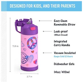 Thermos Garrafa Térmica Infantil com simbolo da Paz e Alça Roxa 355ml Considerada internacionalmente a melhor Garrafa Térmica Infantil, pela qualidade, segurança, design e custo-benefício. A Garrafa Térmica Thermos Funtainer é o jeito mais leve e divertido de manter as crianças hidratadas o dia todo. É alegria garantida para pais e crianças. Ideal para manter a temperatura perfeita de água, sucos e outras bebidas por até 12 horas. É uma garrafa térmica fácil para a criança abrir através do sistema de abertura com mão única e o canudo em silicone macio que acompanha o produto proporcionando conforto na hora de beber, além da alça de transporte integrada ao produto com design leve e compacto, perfeita para todas as ocasiões. Uma garrafa para crianças, leve, resistente a quedas e não transpira por fora já que é feita parede dupla de aço inoxidável, tecnologia de isolamento a vácuo pioneira e patenteada pela Thermos. Ela irá acompanhar o seu filho em todas as fases do seu desenvolvimento, sendo um parceiro de grande momentos. Além disso, é segura para as crianças porque a tampa e o canudo são BPA Free, que significa plástico livre de BPA Bisfenol A . Por isso não libera substância tóxica no contato com temperaturas elevadas, como colocar em máquina lava-louças ou limpar com água quente, sendo extremamente seguro e higiênico. Inclusive, a tampa é cambiável e, conforme as fases de desenvolvimento da criança, pode ser adaptada e modificada. ESPECIFICAÇÕES TÉCNICAS Material: Aço inoxidável e plástico BPA Free livre de Bisfenol A Retenção para frio: 12 horas Capacidade: 410 ml Dimensões AxLxP : 21 cm x 7cm 7xcm Marca: Não Informado Ean: 041205766315