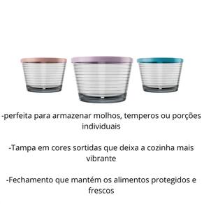 A Tigela de Vidro Ginga 145ml com Tampa Cor é a escolha ideal para armazenar pequenas porções com praticidade e estilo. Com capacidade de 145ml, é perfeita para servir molhos, patês, sobremesas individuais, temperos ou snacks, mantendo os alimentos frescos por mais tempo. Produzida em vidro resistente e higiênico, não retém odores nem manchas, garantindo maior durabilidade e preservação da qualidade. A tampa colorida e funcional assegura um fechamento eficiente, evitando vazamentos e facilitando o transporte. Compacta e versátil, é ideal para uso diário, organização e praticidade na cozinha. Especificações: - Marca: Nadir; - Modelo: 3256; - Com Tampa: Sim; - Capacidade: 145ml; - Diâmetro: 6,5 cm; - Dimensões: 8 x 8 x 6 cm; - Material: Vidro, Plástico; - Recomendações: A tampa não deve ser exposta a altas temperaturas forno ou micro-ondas ; - : 3 meses 90 dias . Conteúdo da embalagem: -01 Tigela de Vidro Ginga 145ml com Tampa Cor .