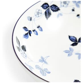 As videiras desenhadas à mão e os morangos maduros que circundam o exterior criam um contraste encantador com o corpo liso da porcelana, adicionando um toque de elegância. A coleção Wild Strawberry Inky Blue pode ser facilmente combinada com outras coleções Wedgwood, permitindo a criação de um visual único e personalizado.