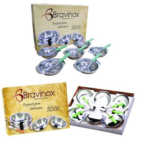 Tigela De Sobremesa De Inox Com Colher Kit Com 12 Pecas Delicias - Bravinox Tigela De Sobremesa De Inox Com Colher Kit Com 12 Pecas Delicias Um bom almoço sempre acaba com uma bela sobremesa. Com a Tigela De Sobremesa De Inox você estará preparado para este momento e não precisará improvisar na escolha dos recipientes. Informações Adicionais: Ean: 7899793300526 Validade: Indeterminada Tamanho Aproximado da Caixa: A:23xl:31cm Peso Aproximado: 320g Tipo de Produto: Conjunto de Tigela para Sobremesa Delicias Com 12 Unidades na Caixa Cor: Prata Composição: Inox e Plastico Ean: 7899793300526