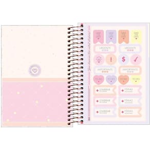 - Bolsa: de papel decorada. - Capa: dura. - Capa acabamento: com detalhe metalizado. - Conteúdo: Controle financeiro, Metas e objetivos e Página para planejamento do futuro. - Cor: diversas. - Espiral: Colorido. - Folhas: decoradas. - Formato: 129mm x 187mm. - Gramatura: 63 g/m². - Material: Capa Dura Com Acabamento Metalizado. - Número de folhas: 176 folhas. - Parte interna da capa decorada: Sim. - Produto certificado: FSC. - Visão: diária exceto sábado e domingo.
