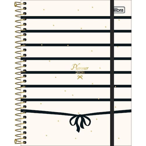- Capa: dura. - Capa acabamento: com detalhe metalizado. - Conteúdo: Controle financeiro, Listas, Metas e objetivos e Página para planejamento do futuro. - Cor: diversas. - Espiral: Colorido. - Fechamento: com elástico. - Folhas: para anotações. - Formato: 177mm x 240mm. - Gramatura: 63 g/m². - Material: Capa Dura Com Acabamento Metalizado. - Número de folhas: 80 folhas. - Parte interna da capa decorada: Sim. - Produto certificado: FSC. - Visão: anual, mensal e semanal.