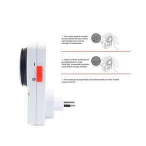 Até 48 combinações em 24 horas Tempo mínimo: 15 min / Tempo máximo: 24 h Bivolt 110/220V Capacidade Mostrador circular com escala de hora e minuto Move no sentido anti-horário para indicar o tempo restante Tomada: Pino redondo padrão 10A