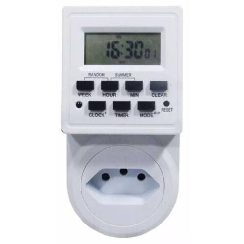 O Temporizador Digital liga e desliga cargas diversas com programações que vão desde minutos até semanais. Possui até 18 programações 9 ON e 9 OFF por dia , além de possibilitar o acionamento ou desligamento manual.Especificações TécnicasTensão: 127 / 220 VCA Bivolt Automático Frequência: 50 / 60 HzConsumo Standby: 1,6 WPlugue e tomada elétrica padrão NBR14136Programação: horas, minutos, diária e semanalAté 18 programações diárias 9 ON e 9 OFF Temperatura ambiente de operação: 0 a 40ºCBateria interna recarregável NI MH 1,2 V 80 mAPotência de comando para carga resistiva: Em 127 Volts = 1000 W ou 400 VA, e em 220 Volts = 2000 W ou 800 VAPotência de comando para carga indutiva: Em 127 Volts = 300 W, e em 220 Volts = 600 WNa ausência da alimentação elétrica, o relógio e os dados de programação são retidos por até 100 horas.