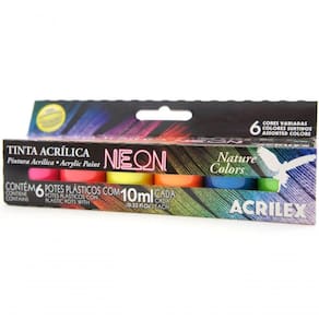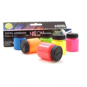 Tinta Acrílica Nature Colors Neon 6 Cores - Acrilex As cores vibrantes da tinta Neon vão deixar suas peças ainda mais lindas, decore o ambiente com peças em MDF ou vários outros materiais pintados com ela e transforme qualquer local, com toque moderno e incrível. Ideal para pintura em Madeira, MDF, Papel, Cerâmica, Isopor, Gesso e Cortiça. Modo de usar: - Pode ser aplicada com pincel, esponja ou rolinho de espuma. Para efeitos HIGHLIGHT Para trabalhos com efeitos de luz e sombra Efeito Fluorescentes sob luz negra. Garantia: 3 meses contra defeitos de fabricação pelo fabricante Imagens meramente ilustrativas. Uso - Escolar Tipo - Tinta Tintas - Acrílica Ean: 7891153070742