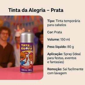 Transforme o visual de forma rápida e divertida com a Tinta Da Alegria Sua fórmula temporária em spray colore os cabelos com praticidade, sendo perfeita para festas, fantasias, eventos escolares, carnaval e diversas comemorações.
