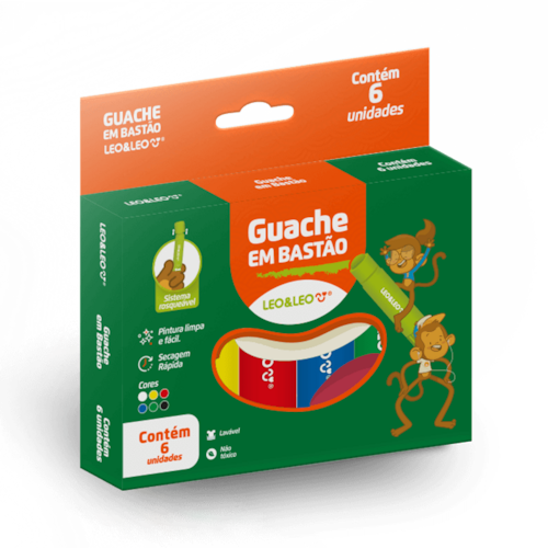 O Guache em Bastão - Caixa com 6 Cores Leo&Leo chegou para mostrar que a alegria de pintar com guache não precisa virar um drama na hora da limpeza. É a solução perfeita para as crianças soltarem a imaginação, sem fazer aquela bagunça com as tintas. Seu design é inteligente e possui um mecanismo rosqueável similar ao de uma cola bastão, favorecendo a organização e aumentando a durabilidade do produto, já que evita o desperdício. O segredo deste gauche é o aspecto mais rígido da tinta, semelhante ao giz de cera.
