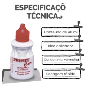 Tinta para Carimbo Vermelha 134 Printy Car 40ml - Alta qualidade para marcas sempre visíveis A tinta para carimbo Printy Car oferece alta fixação e cor vibrante na tonalidade vermelha, ideal para e pessoal. Com secagem rápida, garante impressões nítidas e longevidade, evitando borrões e manchas. Seu frasco de 40ml com bico aplicador facilita o uso e a recarga de carimbos, proporcionando praticidade e economia para o seu dia a dia. Principais benefícios: - Secagem rápida para resultados imediatos - Cor vermelha intensa que destaca suas marcas - Frasco de 40ml com bico aplicador para uso prático - Compatível com diversos tipos de carimbos - Formulação que evita manchas e borrões Ideal para empresas, escritórios e profissionais que precisam de carimbos sempre claros e confiáveis. Garanta qualidade e durabilidade em cada impressão com a tinta para carimbo Printy Car. Marca: Não Informado Ean: 7890922729621