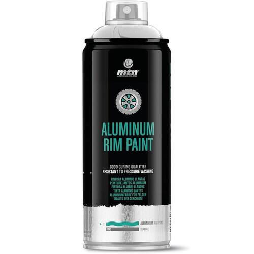 Tinta Spray Para Aros e Rodas Aluminum Rims 400ml PRO MTN Esmalte acrílico termoplástico de secagem muito rápida formulado com resinas de altíssima qualidade para dar uma aparência renovada aos aros de automóveis ou onde seja necessário um acabamento de alta qualidade semelhante ao alumínio.