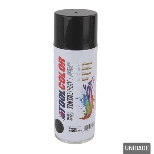 Tinta Spray USO Geral 400ml Preto Brilhante Tinta spray uso geral ToolColor é a solução perfeita tanto para aplicações internas quanto externas em uma ampla variedade de superfícies, incluindo gesso, isopor, ferro, plástico, tecidos e emborrachados. Com sua fórmula versátil e de alta qualidade, ela oferece resultados excepcionais e duradouros. Secagem rápida, em até 5 minutos.\nEspecificações: Marca : AEROFLEX Tipo de material : Resinas Sintéticas, Pigmentos Orgânicos, Solventes, Aditivos Cores ou Estampa : Preto Brilhante Dimensões do Produto : 20 X 6,5 X 6,5 CM Dimensões da Embalagem : 20 X 6,5 X 6,5 CM Peso Bruto (Gramas) : 0.361 Contém: 400ml / 250g. Cor: Preto Brilhante.