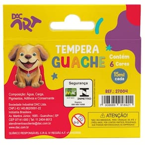 Embalagem: 6 cores vibrantes, cada uma com 15 ml, oferecendo variedade e possibilidades criativas para os desenhos. Fácil de limpar: superfícies e roupas podem ser rapidamente limpas, garantindo que a diversão não deixe marcas permanentes. Experiência de pintura: guache é ideal para para pinturas em papel e cartolina. Certificado pelo de inmetro:ocp 0061 registro: 014009/2024 Formúla não tóxica. Produto seguro e confiável, atendendo aos padrões de qualidade e segurança para crianças. Marca: Não Informado Ean: 7908689918445