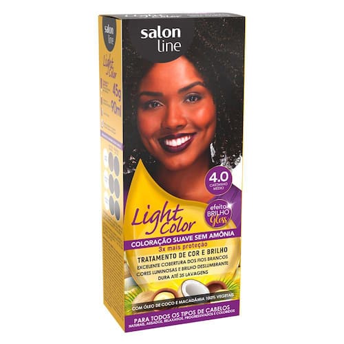 Para quem tem até 50% de cabelos brancos dispersos, a Tintura Light Color Salon Line é uma excelente opção, pois lhe proporcionará reflexos deixando um aspecto luminoso, mascarando os fios brancos suavemente.