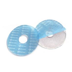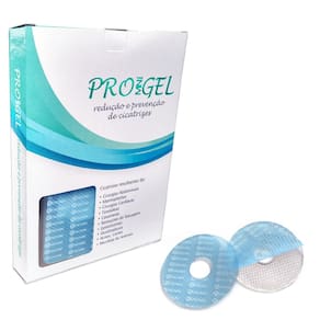 Tira em gel de silicone, formato disco, 100% silicone grau médico, adesiva, reforçada por uma película também de silicone, macia e semi-oclusiva.
