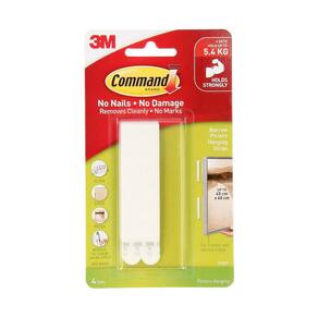 As tiras suspensas Command Narrow Picture, brancas, de 4 pares, comportam até 12 libras.