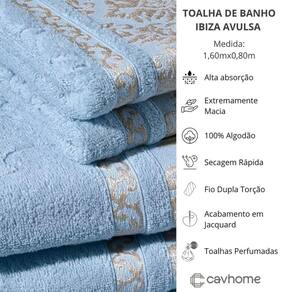 Principais Características: Material Premium: confeccionada com fio 100% algodão convencional de dupla torção, garantindo alta absorção e toque suave.Tecido Nobre: produzida em tear Jacquard, o que resulta em um tecido sofisticado e durável, reconhecido pela sua complexidade e qualidade.Design Exclusivo: arabescos elegantes e barrado com detalhes dourados que valorizam o ambiente.Tamanho Generoso: toalha de banho gigante, Banhão, com medidas de 0,80 x 1,60 m, perfeita para envolver seu corpo com conforto.Gramatura Ideal: 450 g/m², oferecendo equilíbrio perfeito entre maciez e resistência. Conteúdo do Produto: 01 Toalha de banho gigante Cuidados e Recomendações:Para manter a beleza e a qualidade da sua toalha Ibiza, siga as instruções de lavagem indicadas na etiqueta.