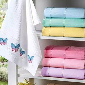 O modelo possui lindas cores e acabamento em jacquard em todo o corpo da toalha que formam linhas em alto relevo. Além disso, a peça é ideal para trabalhos em bordado, possui uma barra com altura de 60 pontos.