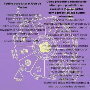 A Toalha Tecido Jogo de Cartas Cigana da Bialluz são ótimas para te auxiliar durante o jogo de cartas, por ser um elemento que proporciona alta elevação enérgica. Você também pode usar para decorar seu altar, com certeza ficara ainda mais lindo e com muita energia positiva. Nossa toalha possui altíssima qualidade na impressão com pontos de brilho e é confeccionada em tecido oxford que não amassa e tem longa durabilidade.
