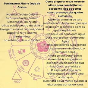 A Toalha Tecido Jogo de Cartas Cigana da Bialluz são ótimas para te auxiliar durante o jogo de cartas, por ser um elemento que proporciona alta elevação enérgica. Você também pode usar para decorar seu altar, com certeza ficara ainda mais lindo e com muita energia positiva. Nossa toalha possui altíssima qualidade na impressão com pontos de brilho e é confeccionada em tecido oxford que não amassa e tem longa durabilidade.