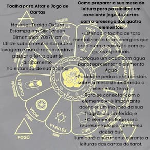 A Toalha Tecido Jogo de Cartas Cigana da Bialluz são ótimas para te auxiliar durante o jogo de cartas, por ser um elemento que proporciona alta elevação enérgica. Você também pode usar para decorar seu altar, com certeza ficara ainda mais lindo e com muita energia positiva. Nossa toalha possui altíssima qualidade na impressão com pontos de brilho e é confeccionada em tecido oxford que não amassa e tem longa durabilidade.