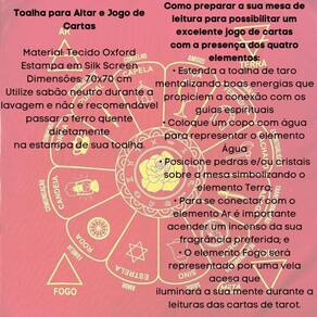 A Toalha Tecido Jogo de Cartas Cigana da Bialluz é ótima para te auxiuliar durante o jogo de cartas, por ser um elemento que proporciona alta elevação enérgica. Você também pode usar para decorar seu altar, com certeza ficara ainda mais lindo e com muita energia positiva. Nossa toalha possui altíssima qualidade na impressão com pontos de brilho e é confeccionada em tecido oxford que não amassa e tem longa durabilidade.