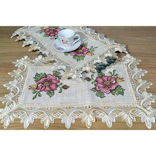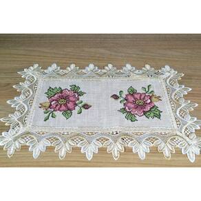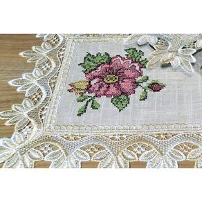 Toalha de bandeja em tecido poliéster, na cor palha, com lindos bordados em ponto cruz de flores nas cores rosa, bege, branco e folhas verdes e acabamento em renda guipir em toda lateral.