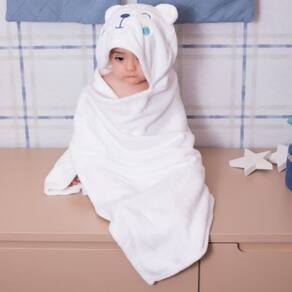 A Toalha de Banho Baby Laço Bebê Urso é produzida em tecido 85% poliéster e 15% poliamida, com modelagem poncho e capuz.
