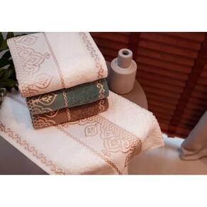 Esta toalha recebe o desenho em Jacquard, e é beneficiada com tingimento reativo que impede a alteração da cor autêntico e garante solidez. Sua composição é em 100% algodão, massa pura de fibras longas e fio convencional dupla torção, proporcionando super maciez. Seu barrado é composto por poliéster metalizado exaltando as características do desenho, fazendo jus ao estilo que a inspirou.