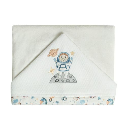Toalha de banho bebê menino espacial azul 87x88 cm - hug A toalha de banho hug é perfeita para ser levada para a maternidade. Pois quando o bebê nasce, sua pele ainda é muito sensível e frágil, e a toalha de banho hug possui toalha fralda em algodão, que é ótima para não agredir a pele do recém-nascido. Além disso, possui capuz, perfeito para cobrir a cabeça do bebê e levá-lo para a troca de roupa. Diferenciais: Toalha fralda em algodão, perfeita para a pele sensível do recém-nascido; Com capuz; Nanotecnologia que agrega maciez e tratamento anti pilling, que torna o produto mais resistente às lavagens, proporcionando maior durabilidade, e retardando o aparecimento das bolinhas na malha; Suedine com nanotecnologia que agrega maciez e tratamento antibacteriano e antifúngico; Bordado protegido com aplique e estampa rotativa exclusiva hug. medida: