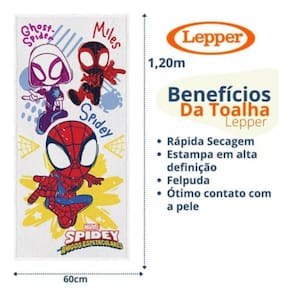 Toalha de Banho Infantil Estampada 60x120 cm LepperDimensões: 60x120 cm, tamanho ideal para crianças, proporcionando uma cobertura adequada e confortável após o banho.Composição: Feita com 95% algodão e 5% poliéster, oferecendo um toque suave, boa absorção e durabilidade.Estampa Infantil: Disponível em diversas estampas temáticas, que encantam e tornam o banho mais divertido para os pequenos.Material Felpudo: Superfície felpuda que garante uma ótima absorção, secando a pele de maneira rápida e eficaz.Conforto ao Tocar: O algodão proporciona uma sensação macia e agradável, ideal para a pele delicada das crianças.Fácil de Cuidar: Lavável à máquina, mantendo as cores vivas e a maciez do tecido mesmo após várias lavagens.Atraente para Crianças: Perfeita para os pequenos, com estampas que podem incluir personagens populares e temas coloridos, transformando o banho em um momento mais alegre.Durabilidade: A mistura de algodão e poliéster oferece resistência e mantém a qualidade da toalha por muito tempo.Marca Confiável: Produzida pela Lepper, renomada por sua excelência em produtos infantis de alta qualidade.