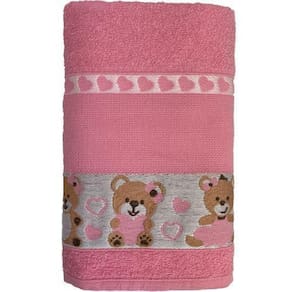 Características: Contém: 01 Toalha de Banho infantil. Barra: Ponto Cruz, para mandar bordar o nome. Composição: Tecido 100% Algodão, exceto efeito decorativo. Dimensão da Toalha: 70 cm x 110 cm. Cor: Rosa Urso DÚVIDAS e INFORMAÇÕES