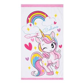 Estampa Encantadora e Cheia de MagiaO grande destaque desta toalha é sua estampa de unicórnio, que transmite delicadeza e fantasia. Com cores suaves e detalhes encantadores, o design cria um visual alegre e mágico, perfeito para estimular a criatividade e tornar o banho um momento especial.A estampa possui excelente definição, com cores vivas que se mantêm bonitas mesmo após várias lavagens.