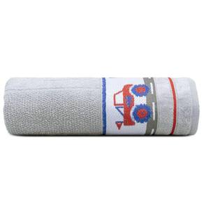 Com a estampa de carros e caminhões na cor cinza.