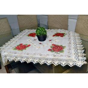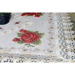 Toalha quadrada em tecido poliéster, na cor palha, com lindos bordados em ponto cruz de flores em tons de vermelho, bege e folhas verdes e acabamento em renda guipir em toda lateral na cor bege e palha.