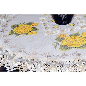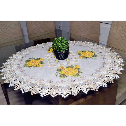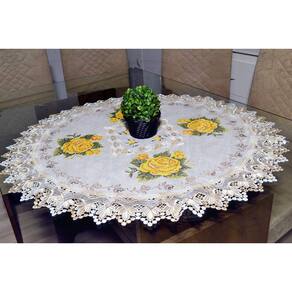 Toalha redonda em tecido poliéster, na cor palha, com lindos bordados em ponto cruz de flores em tons de amarelo, bege , branco e folhas verdes, acabamento em renda guipir em toda lateral na cor bege e palha.