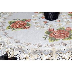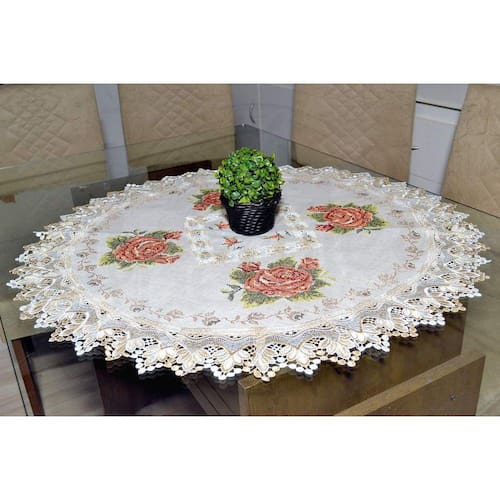 Toalha redonda em tecido poliéster, na cor palha, com lindos bordados em ponto cruz de flores em tons de marrom, bege , branco e folhas verdes, acabamento em renda guipir em toda lateral na cor bege e palha.