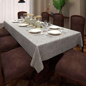 Glamour e sofisticação farão parte do seu ambiente com a toalha de mesa branca retangular 6 lugares com arabescos jacquard.
