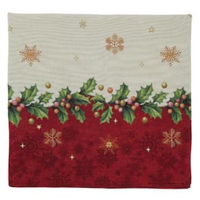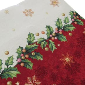 Toalha natalina Happy Christmas de 6-8 lugares, produzida em Gobelin europeu de alta qualidade. Desenho localizado com barra em vermelho. Tudo para deixar a sua ceia de natal deslumbrante e encantadora