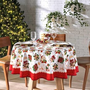 Marca: dohler Modelo: toalha de mesa natalina Composição: 50% algodão 50% poliéster Tamanho: 1,60 metros de diâmetro Gramatura: 170 gramas por metro quadrado Estampa: natal Cor: vermelho/cd