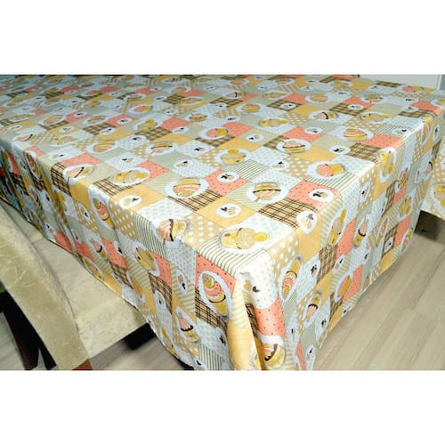 Toalha de mesa em tecido poliéster com estampa de vários cup cakes coloridos, nas cores palha, marrom, salmão e branco e detalhes quadriculados, bolinhas e listrinhas .
