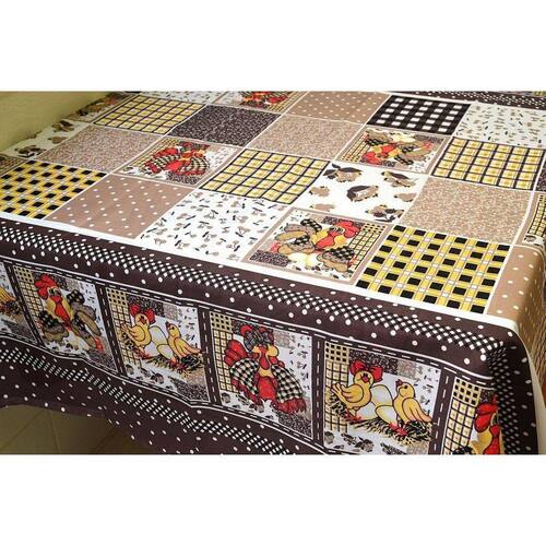 Toalha de mesa fabricada em tecido poliéster, com estampa estilo pacthwork com quadros de diferentes desenhos e cores de várias galinhas e pintinhos nas cores marrom, bege, preto, amarelo, branco e vermelho.